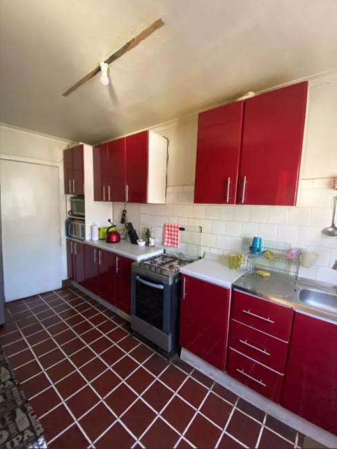 Cocina amoblada con Piso cerámico rojo.
