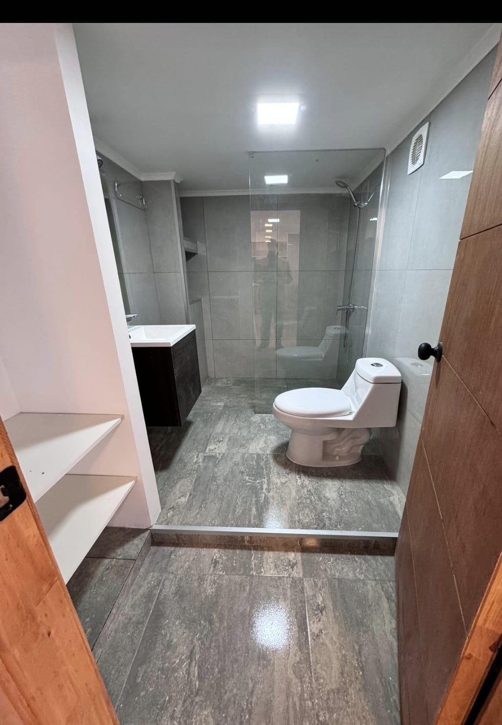 Baño full equipado con doble puerta, uno con entrada desde la habitación y la otra desde el Living Comedor.